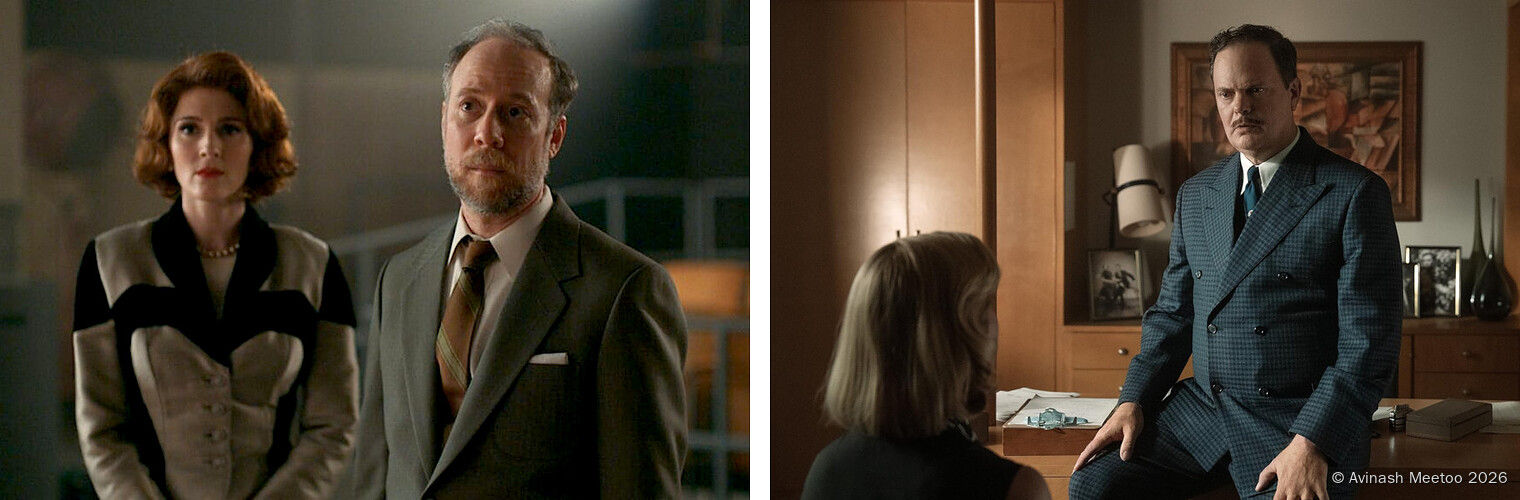 Finally, there are the TV people. First is the shy Walter Pine (by Kevin Sussman) who is the director of the cooking TV show Elizabeth Zott agrees to participate in. At the studio, he meets Fran Frask (by Stephanie Koenig) who, initially works in the chemistry lab but then loses her job until Elizabeth offers her one at the studio. In a reversal of how things happened in the 1950s, Fran asks Walter out.