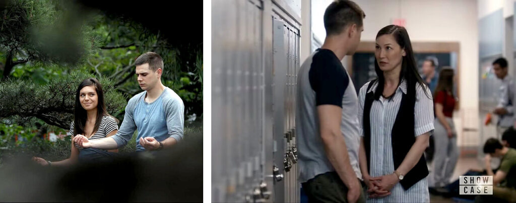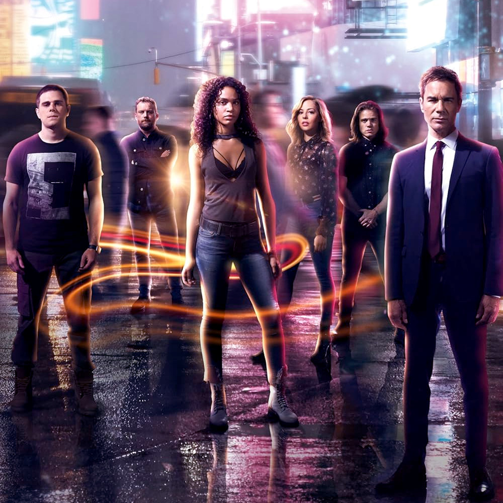 The third “couple” is quite atypical. Trevor Holden (by Jared Abrahamson) is the oldest of the group of travelers but is sent in the past in the body of a young high-school athlete. He is the old wise man. Initially, he has a young girlfriend, Rene Bellamy (by Alyssa Lynch) who Trevor nicely lets go and, later, he falls in love with the older Grace Day (by Jennifer Spence), a programmer from the future.